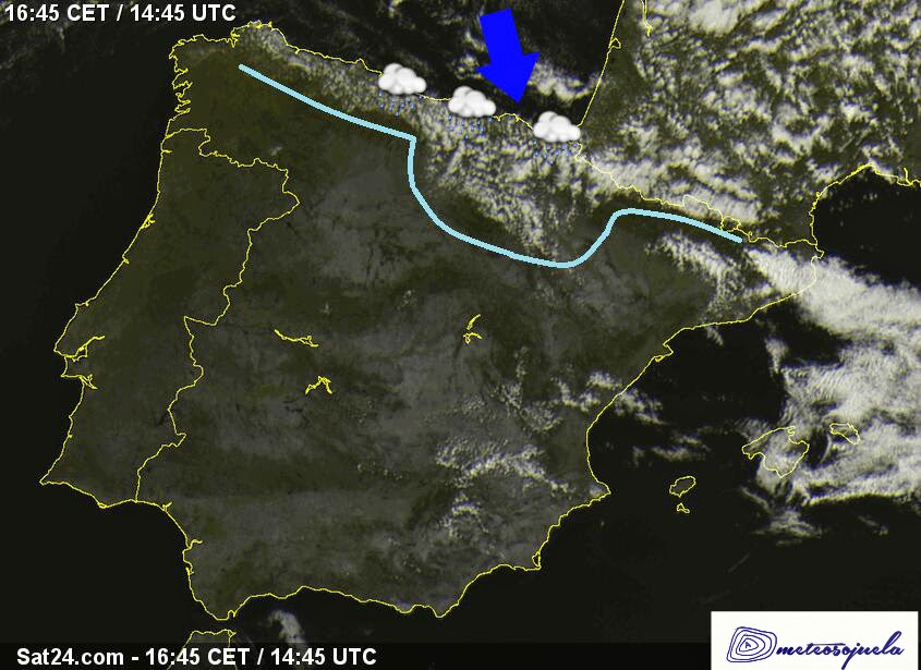y con esta situación... imágen típica de satélite con nubes acumuladas en Cantábrico, valle del Ebro y Pirineos....